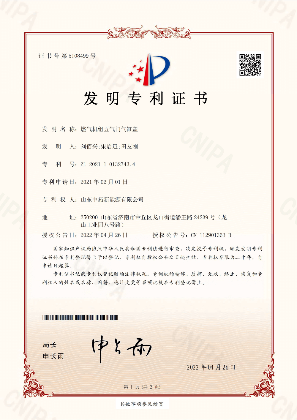 燃氣機組五氣門氣缸蓋
